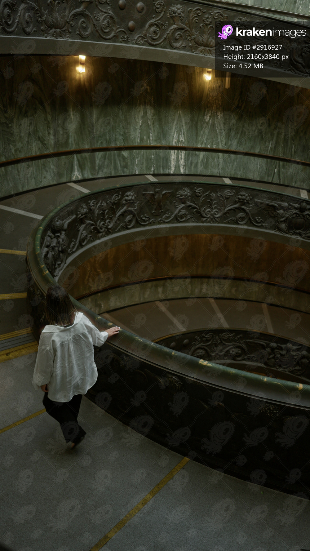 Young hispanic brunette woman walking spiral marble stairs with hand on railing in vatican building; contemplation history.