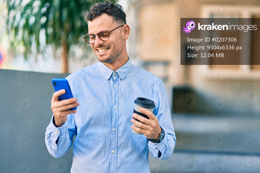 Young hispanic businessman using smartphone and drinking coffee at the city.