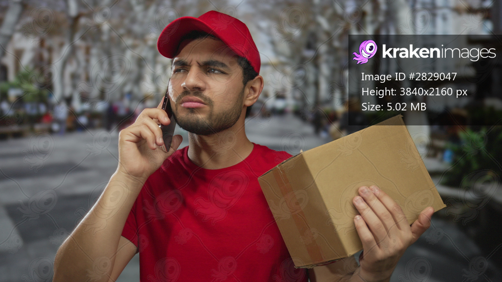 Young hispanic courier holding cardboard box and talking on phone on busy street; reliable service trust commitment.