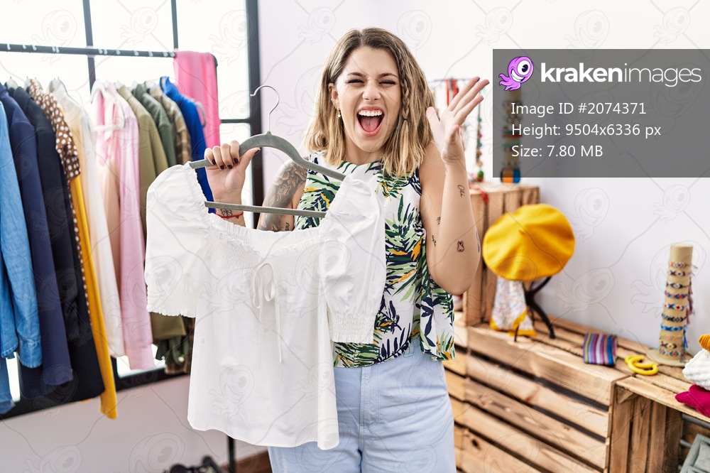 Young hispanic customer woman holding shirt at clothing store celebrating victory with happy smile and winner expression with raised hands
