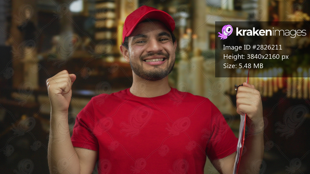 Young hispanic delivery man clenches fist holding a red folder while smiling broadly inside a church building; victory.
