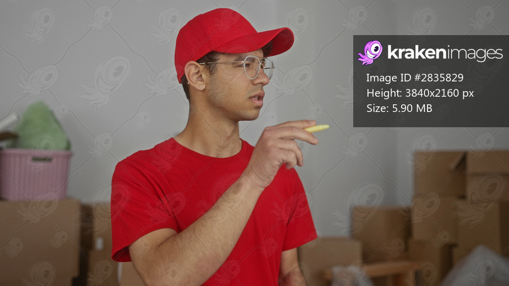 Young hispanic delivery man in red cap and tshirt holds clipboard and yellow pen while checking cardboard boxes in building interior; diligence.