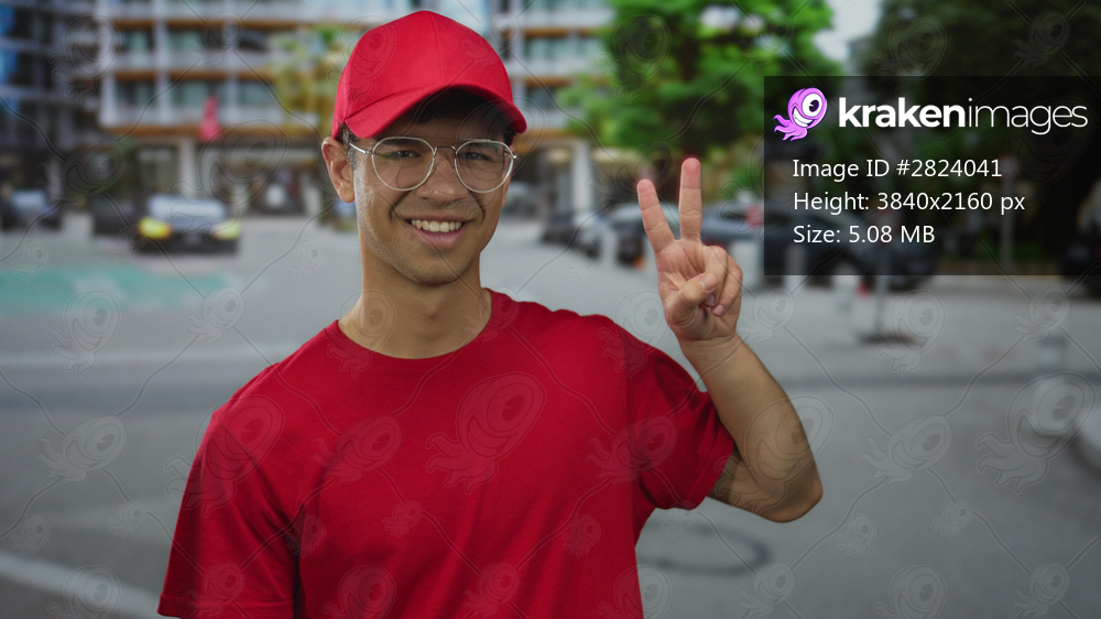 Young hispanic delivery man wearing red cap and t shirt flashing peace sign on busy city street; optimism.