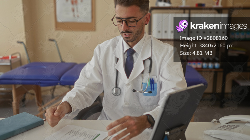 Young hispanic doctor holds head with both hands over paperwork in medical building; stress fatigue burden.