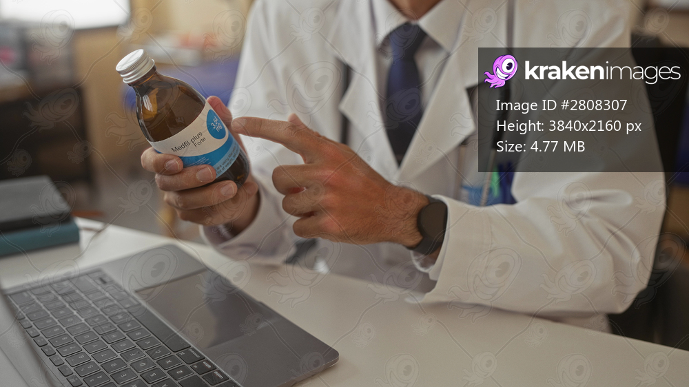 Young hispanic doctor holds medicine bottle and gestures with his hand over a laptop in a clinic; confidence.