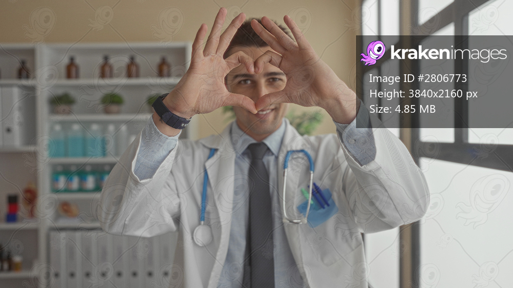 Young hispanic doctor in uniform making heart symbol with hands in hospital room with shelves of medical supplies and large windows