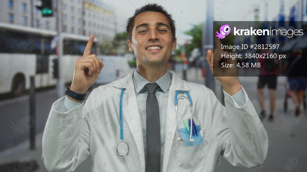 Young hispanic doctor in uniform with stethoscope smiling confidently on urban street featuring buildings and buses, portraying healthcare professionalism outdoors. - Kraken Images