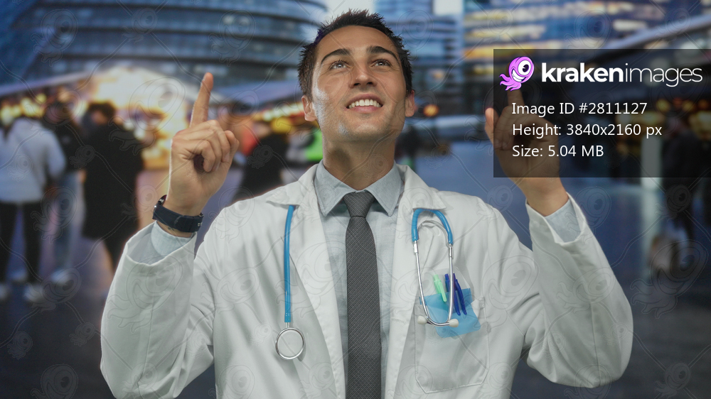 Young hispanic doctor wearing a white coat and stethoscope points fingers upward on busy urban street scene; optimism.