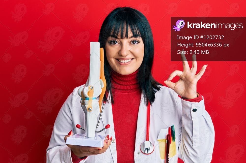 Young hispanic doctor woman holding anatomical model of knee joint doing ok sign with fingers, smiling friendly gesturing excellent symbol