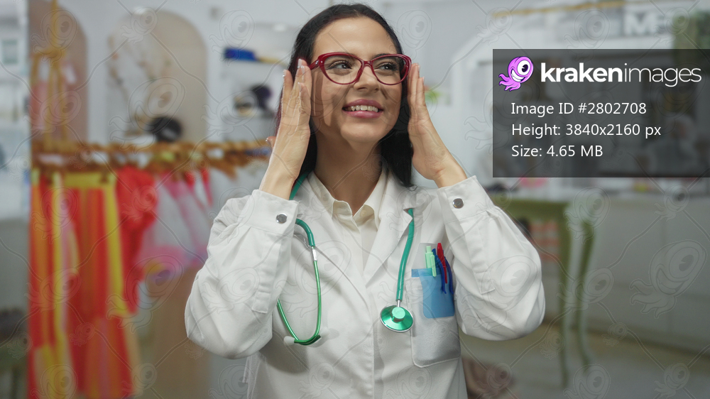 Young hispanic doctor woman with stethoscope smiling confidently inside clothing store full of colorful outfits