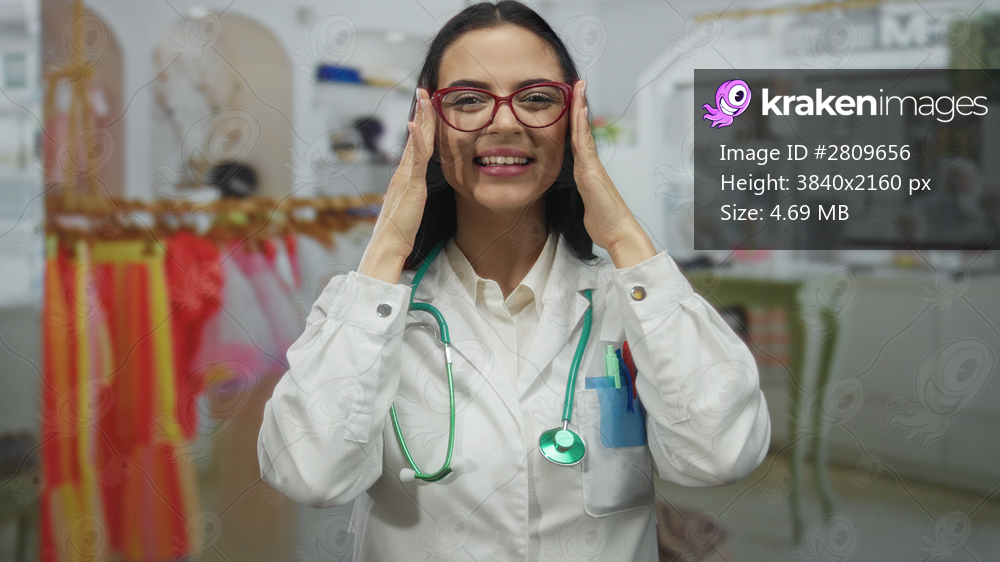 Young hispanic doctor woman with stethoscope smiling confidently inside clothing store full of colorful outfits