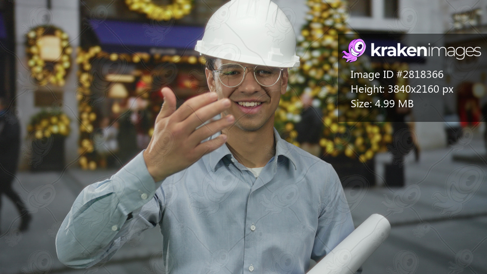 Young hispanic engineer holding rolled blueprint adjusts safety helmet with hand on a busy street; confidence and ambition.