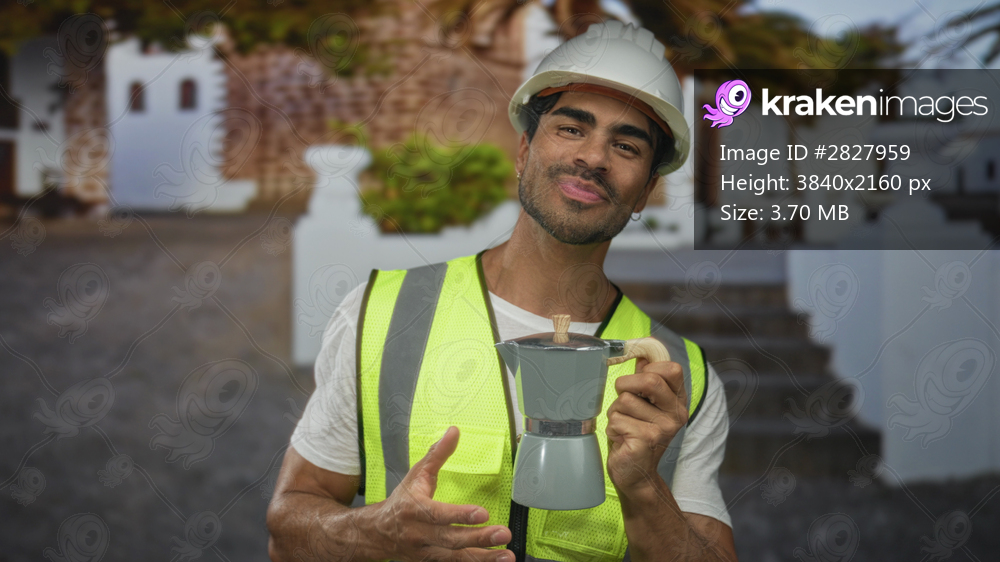 Young hispanic engineer in hardhat and neon vest holds moka pot above palm and smiles near building; contentment.