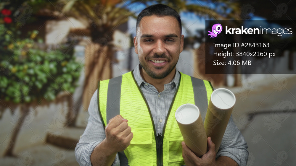 Young hispanic engineer makes a fist pump while holding blueprint near a house on a city street; pride success.