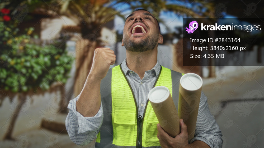 Young hispanic engineer makes a fist pump while holding blueprint near a house on a city street; pride success.