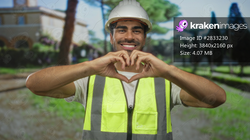 Young hispanic engineer man wearing high visibility vest forms heart gesture with hands at building entrance under sunlight; love compassion.