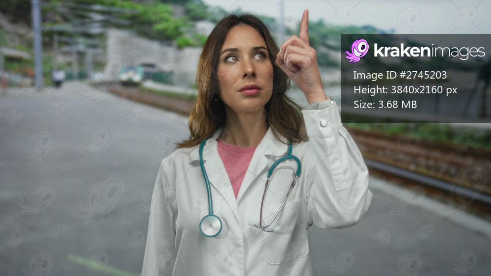 Young hispanic female doctor with stethoscope gesturing at railway station outdoors, conveying a sense of direction and confidence in a professional setting. - Kraken Images