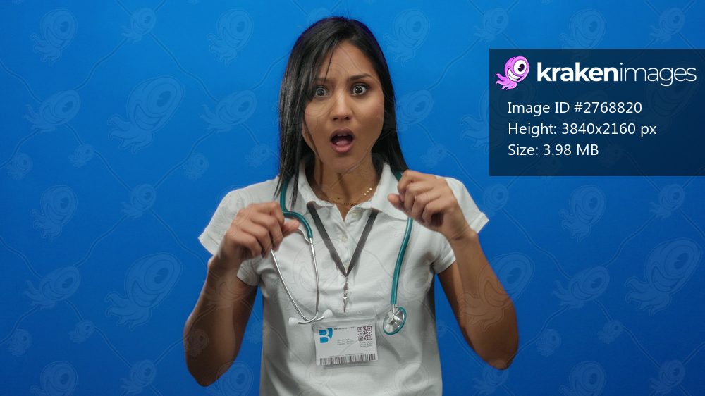 Young hispanic female doctor with stethoscope rubs eyes against a blue wall background, conveying tiredness and stress in a professional setting.
