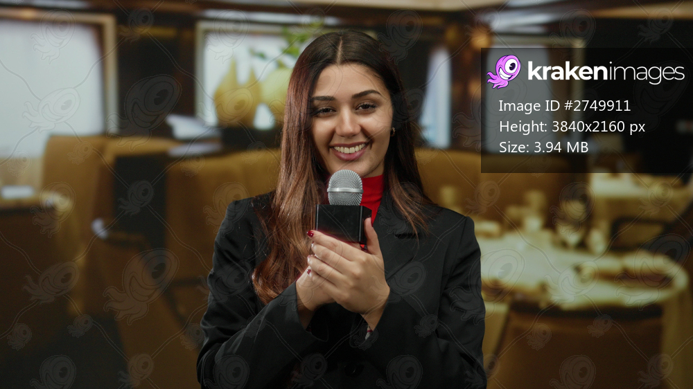 Young hispanic female reporter with microphone in elegant restaurant setting delivering news inside vibrant dining ambiance.