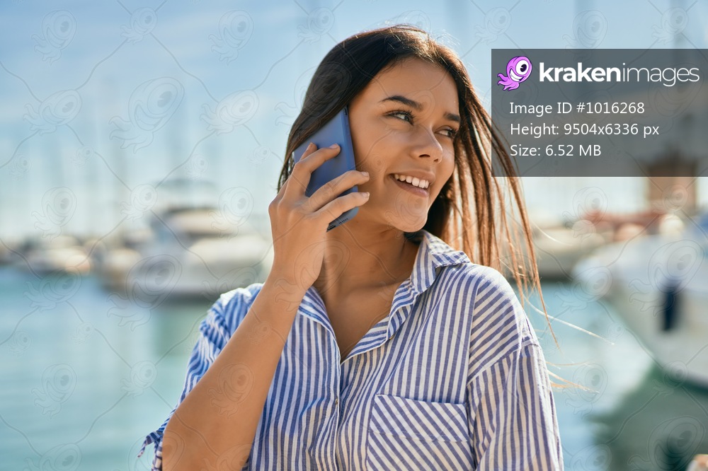 Young hispanic girl smiling happy talking on the smartphone at the port