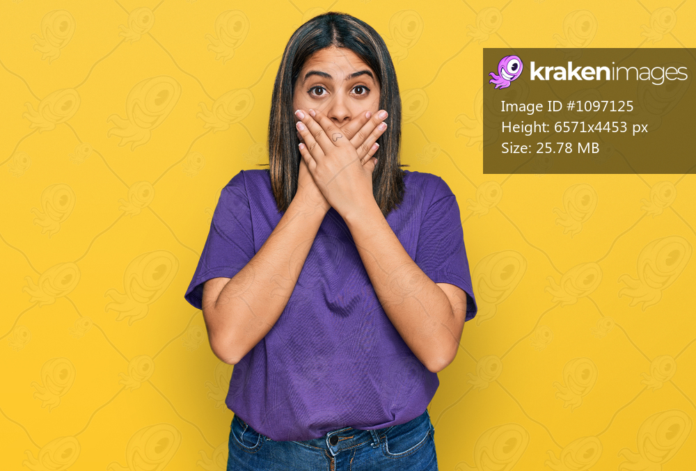 Young hispanic girl wearing casual purple t shirt shocked covering mouth with hands for mistake. secret concept.