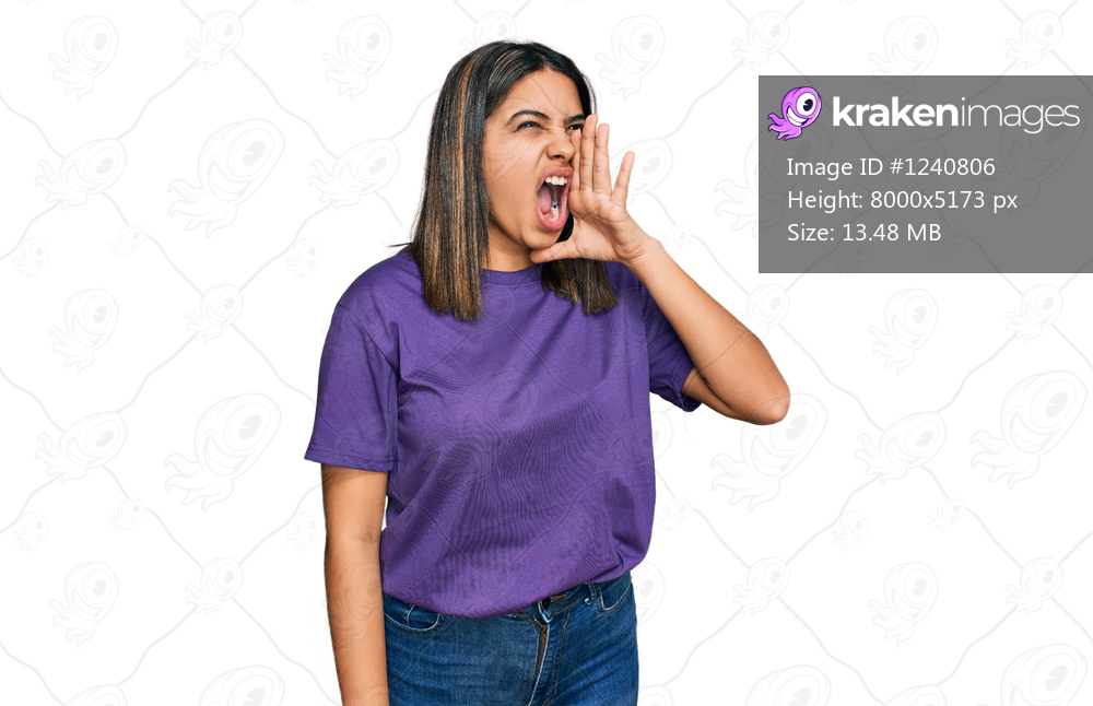 Young hispanic girl wearing casual purple t shirt shouting and screaming loud to side with hand on mouth. communication concept.