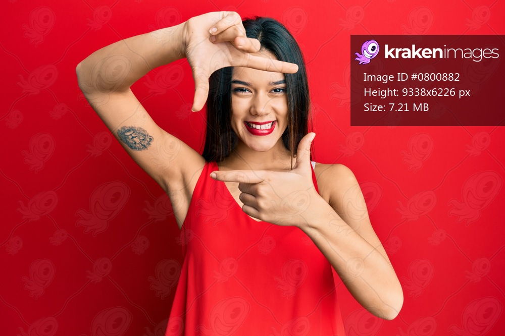 Young hispanic girl wearing casual style with sleeveless shirt smiling making frame with hands and fingers with happy face. creativity and photography concept. - Kraken Images