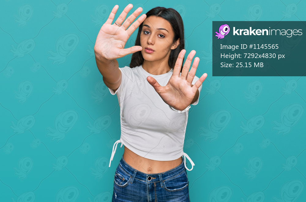 Young hispanic girl wearing casual white t shirt doing frame using hands palms and fingers, camera perspective