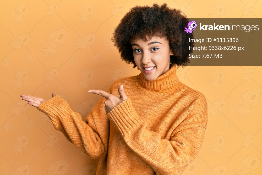Young hispanic girl wearing wool winter sweater amazed and smiling to the camera while presenting with hand and pointing with finger.