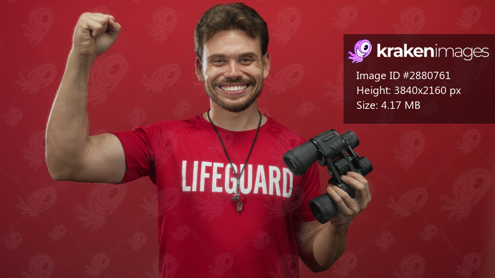 Young hispanic lifeguard man holding binoculars and whistle with clenched fist facing camera in red studio; vigilance safety duty.