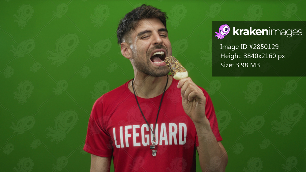 Young hispanic lifeguard man holds popsicle in green studio wearing red shirt and whistle chain; pleasure indulgence summer fun.