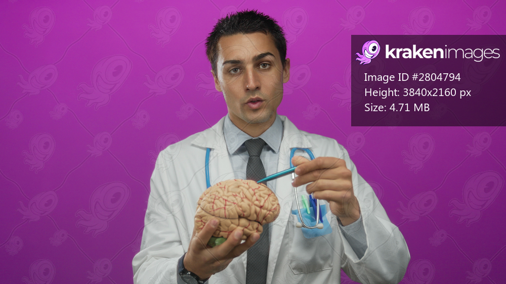Young hispanic male doctor in uniform holding brain model with stethoscope around neck against isolated pink background