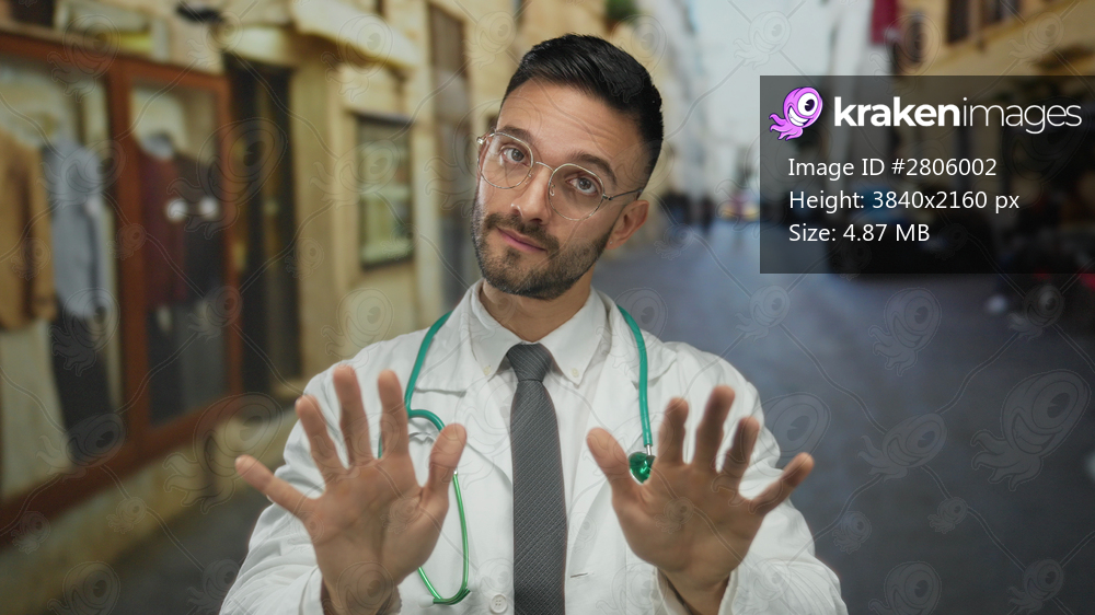 Young hispanic male doctor in white coat with stethoscope standing outdoors on a city street, gesturing for calm, urban setting with blurred background buildings and cars. - Kraken Images