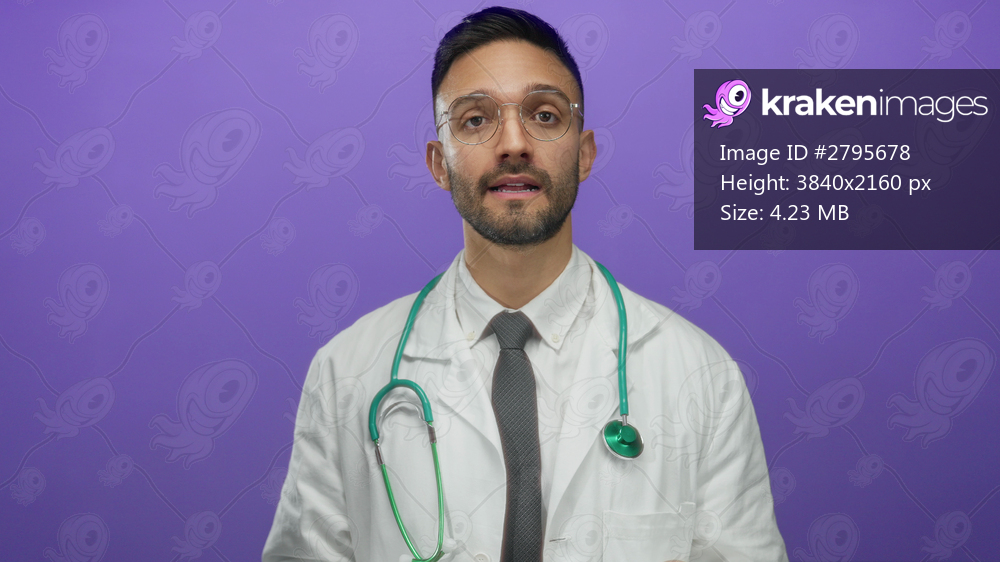 Young hispanic male doctor in white coat with stethoscope stands against vibrant purple background exuding professionalism and expertise in healthcare setting. - Kraken Images