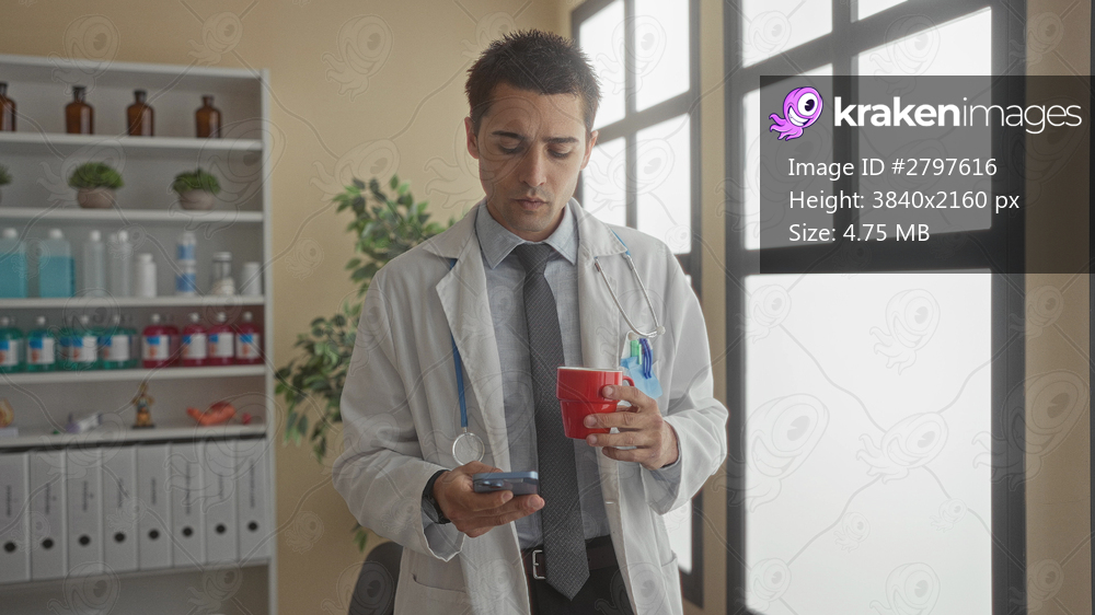 Young hispanic male doctor with stethoscope looks at smartphone in a hospital room surrounded by medical supplies and bright natural light from large window. - Kraken Images