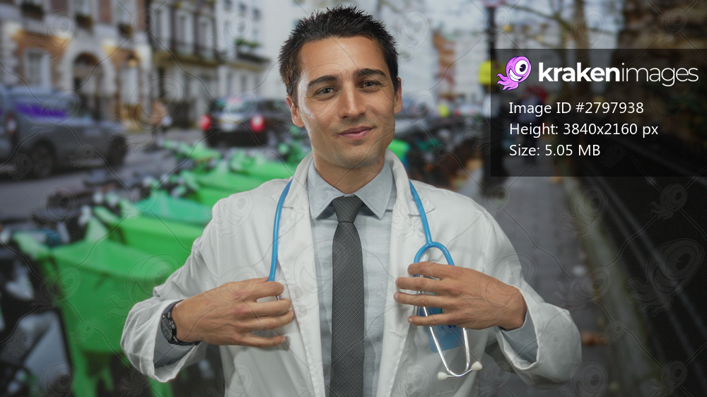 Young hispanic male doctor wearing a white coat and stethoscope stands confidently on a busy city street.