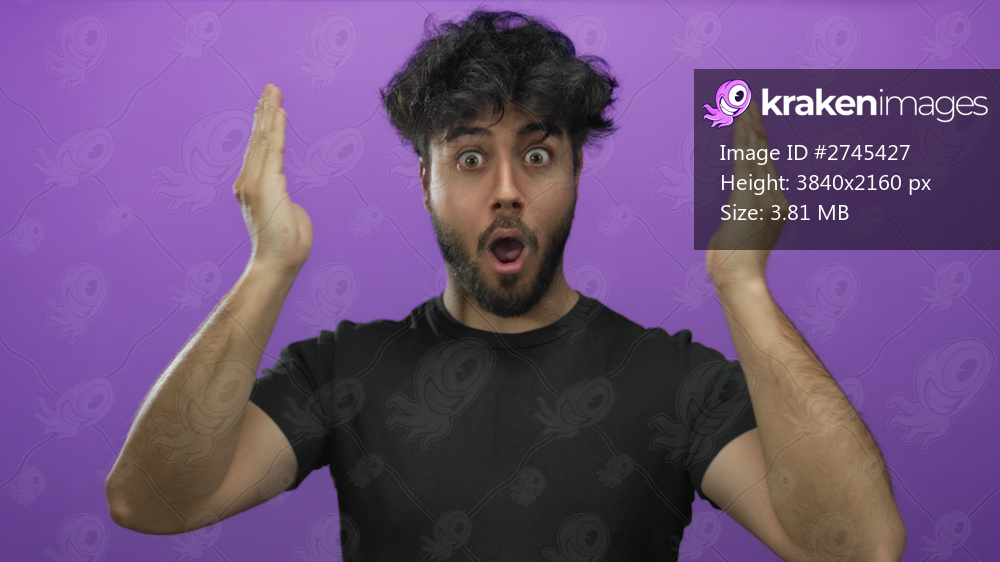 Young hispanic man with a beard alternates between serious and smiling expressions while covering and uncovering his face with his hands against a vibrant purple background. - Kraken Images