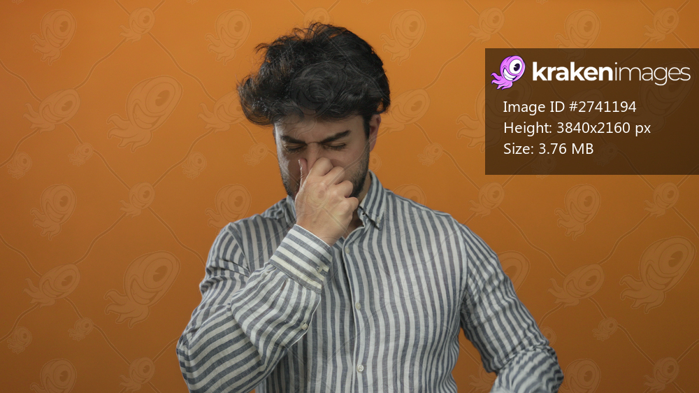 Young hispanic man with a beard covering his nose from a bad smell against an orange background, showing a disgusted expression and wearing a striped shirt. - Kraken Images