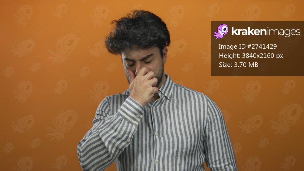 Young hispanic man with a beard covering his nose from a bad smell against an orange background, showing a disgusted expression and wearing a striped shirt. - Kraken Images