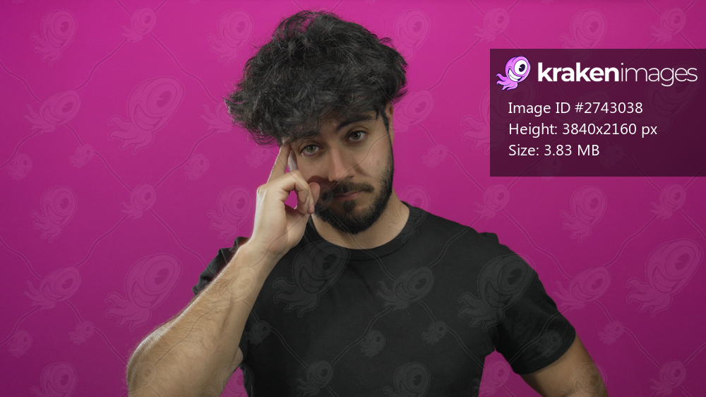 Young hispanic man with a beard making a thinking gesture against a vibrant pink background, looking contemplative and focused.