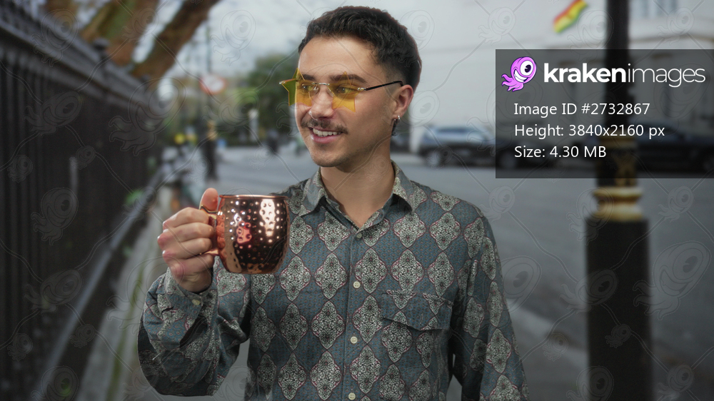 Young hispanic man with a patterned shirt and yellow glasses holds a copper mug on a city street, exuding a cheerful vibe in an outdoor urban setting.