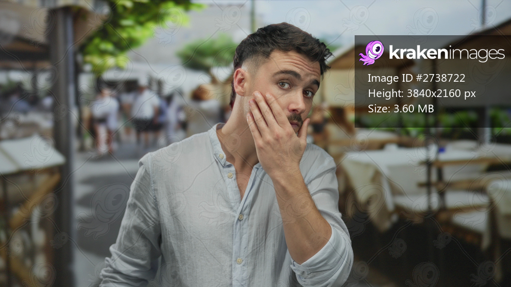 Young hispanic man with a thoughtful expression brushes his hair with his hand while standing on a terrace at an outdoor restaurant, showcasing a relaxed yet stylish vibe. - Kraken Images