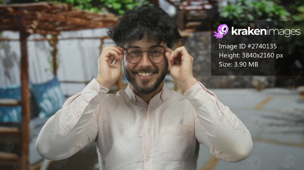 Young hispanic man adjusting glasses outdoors on sunny day, smiling in casual shirt with green foliage in background, conveying positive and joyful mood. - Kraken Images