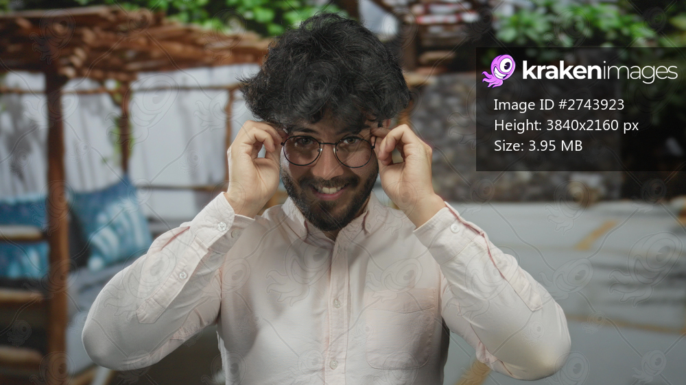 Young hispanic man adjusting glasses outdoors on sunny day, smiling in casual shirt with green foliage in background, conveying positive and joyful mood. - Kraken Images
