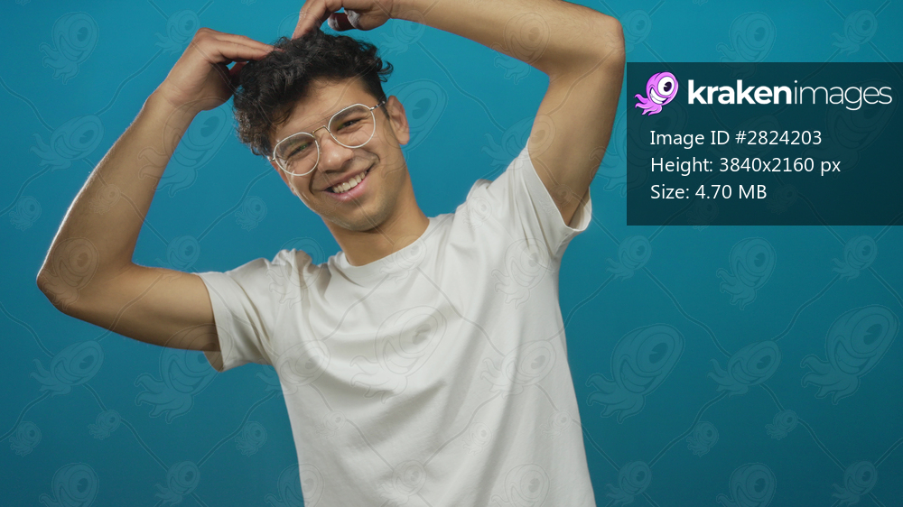 Young hispanic man adjusts curly hair with both hands in blue studio setting; confidence.