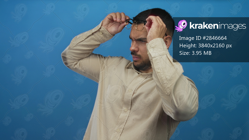 Young hispanic man adjusts glasses against a bright blue studio wall, squinting with a furrowed brow and tense posture; confusion.