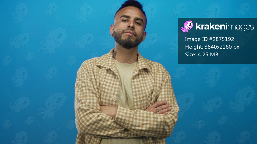 Young hispanic man with arms crossed in blue studio wearing beige checked shirt and direct gaze; confidence.