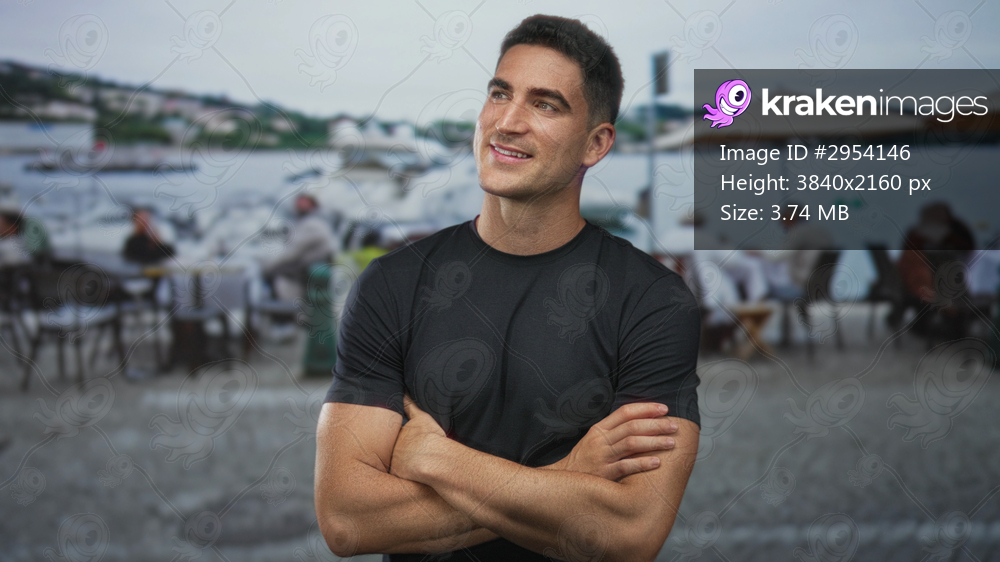 Young hispanic man with arms crossed on a street restaurant terrace by the waterfront, smiling and relaxed; confidence ease.