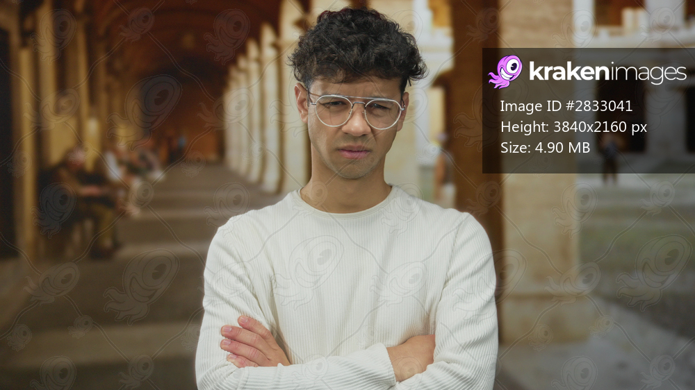 Young hispanic man with arms crossed on old town street under narrow arched colonnade walkway; confusion doubt hesitation uncertainty.