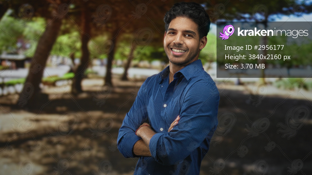 Young hispanic man arms crossed wearing blue buttondown shirt showing forearms and bracelet in forest; confidence approachability.